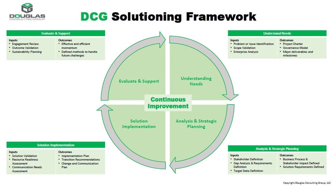 We at Douglas Consulting Group pride ourselves in our proactive, solutions-oriented approach to consulting. In complex and volatile environments our success is derived from having a solid understanding of the dynamics and the sustained capability to anticipate and adapt. Our comprehensive capabilities across all industries and business functions enable DCG to collaborate with our clients to help them become high-performance businesses, school districts and governments.